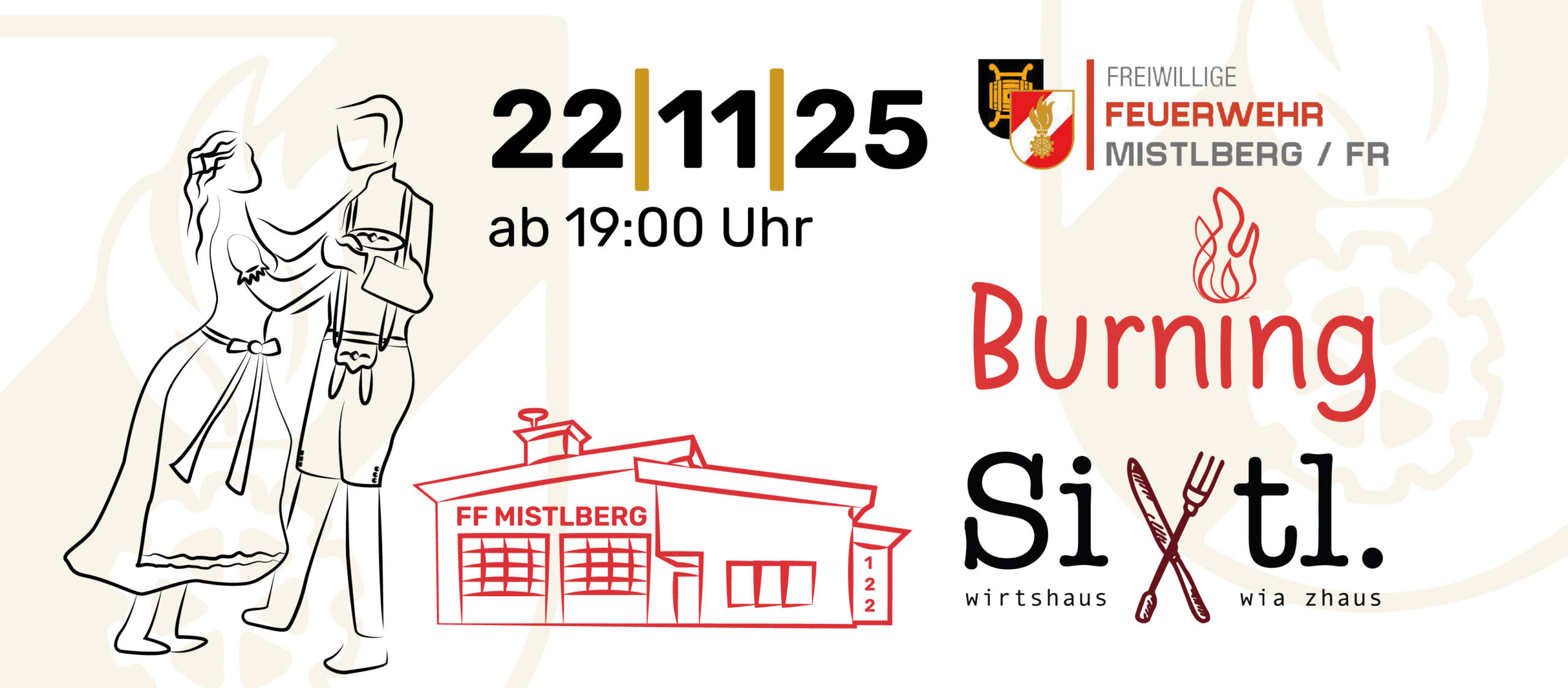 Der traditionelle Ball der Freiwilligen Feuerwehr Mistlberg, findet heuer am 22.11.2025 ab 19:00 Uhr beim SIXTL – Wia Zhaus (Mistlberg 98, 4284 Tragwein) statt.
